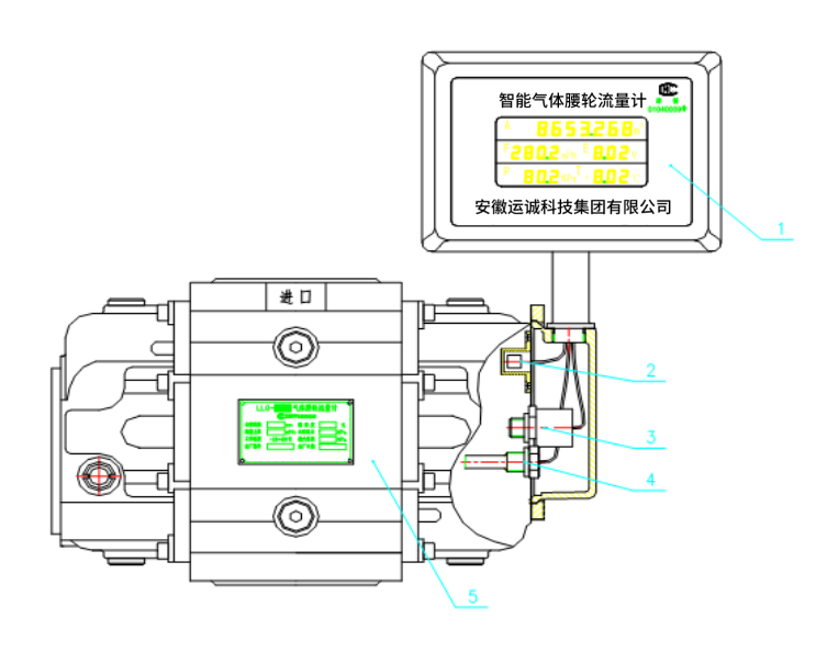 1.气体腰轮流量计 2.流量传感器 3.压力传感器 4.温度传感器 5.智能流量积算仪
